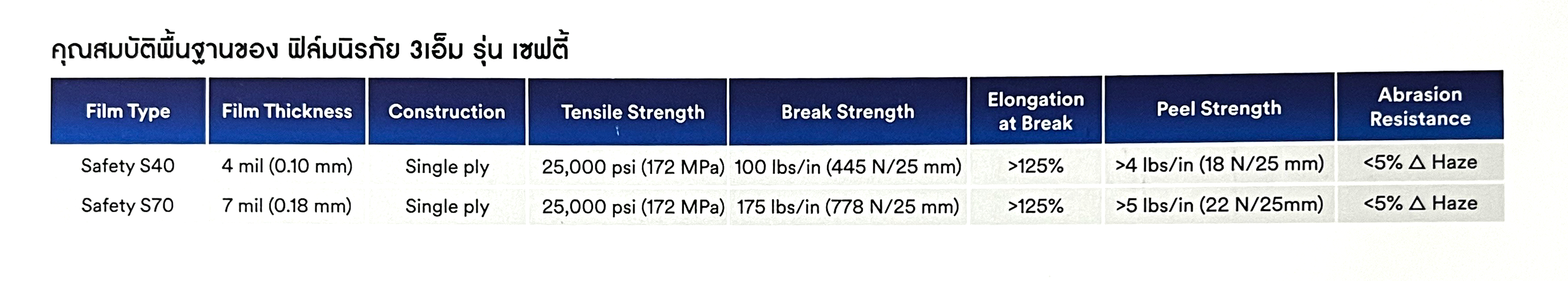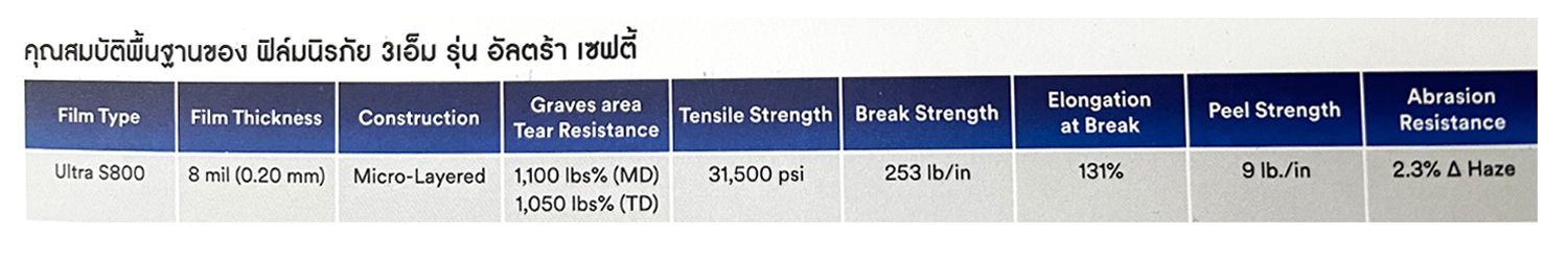 ฟิล์มนิรภัย 3 เอ็ม ผลิตจากโพลีเอสเตอร์เกรดสูง ด้วยเทคโนโลยีที่ดีที่สุดและเป็นลิขสิทธิ์เฉพาะของ 3เอ็ม ซึ่งให้คุณสมบัติที่รองรับความปลอดภัย โดยผ่านมาตรฐานการทดสอบมาตรฐานความเป็นนิรภัยที่แรงกระแทกตั้งแต่ 100-600 ฟุต-ปอนด์ ตามมาตรฐาน ANSI Z97.1 (American National Standards Institute) และ CPSC : CFR16, Part 1201 (The Consumer Products Safety Commission)